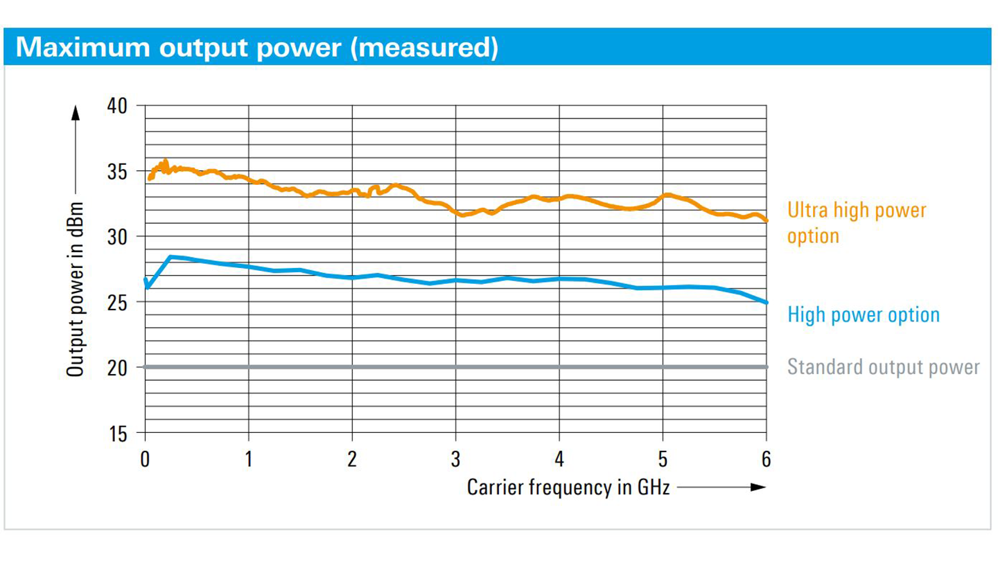 当配备适当的选件时,R&S SMBV100B可产生高达+34 dBm(在1 GHz下测量)的输出功率,并且在几乎整个频率范围内指定的电平增加到+25 dBm。